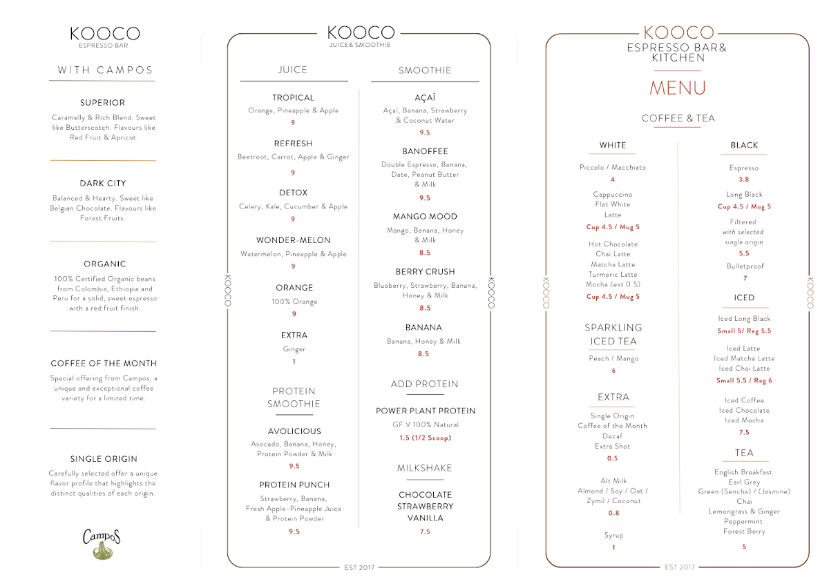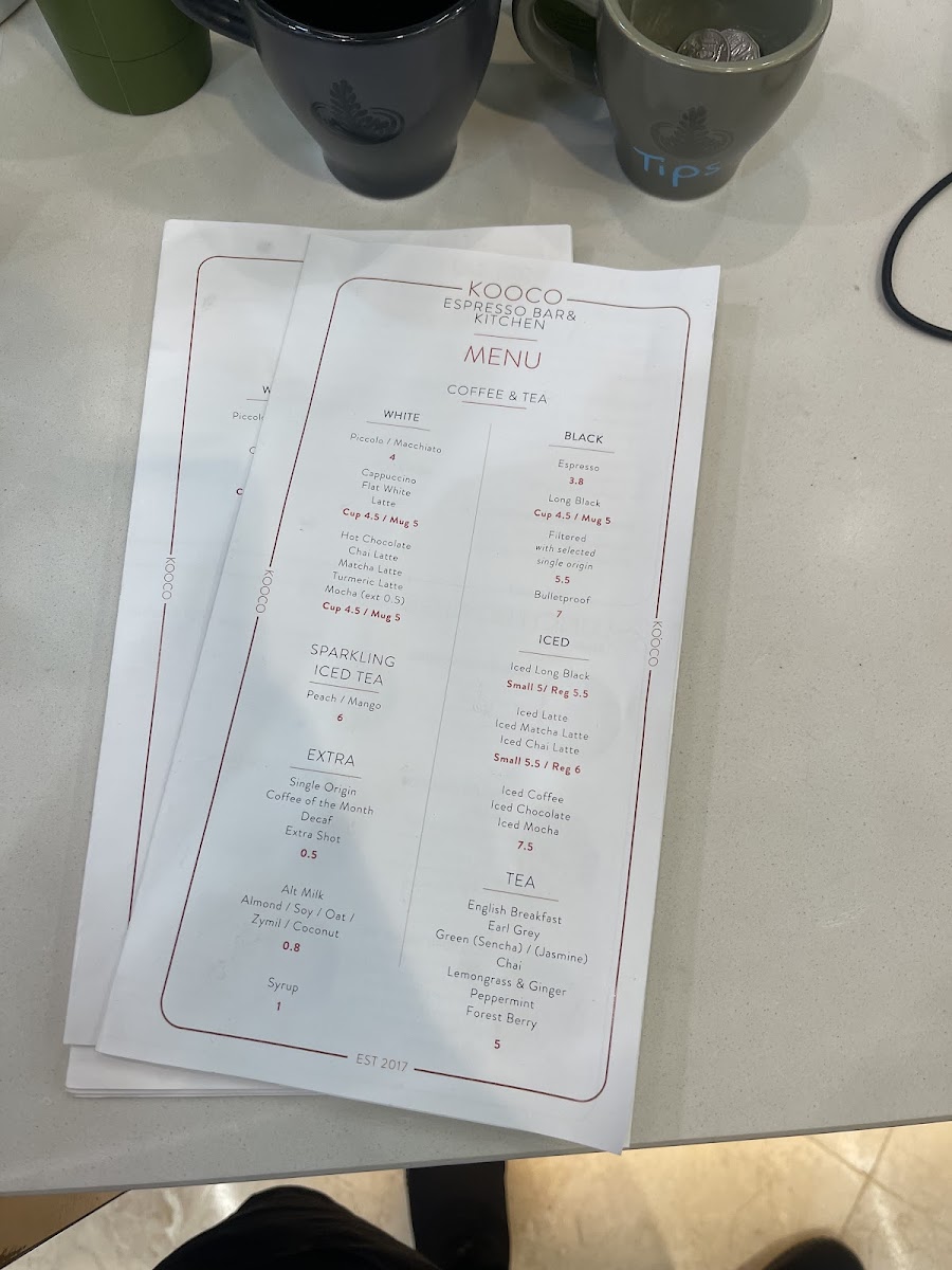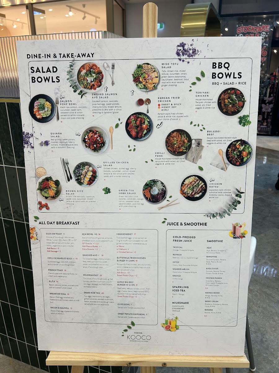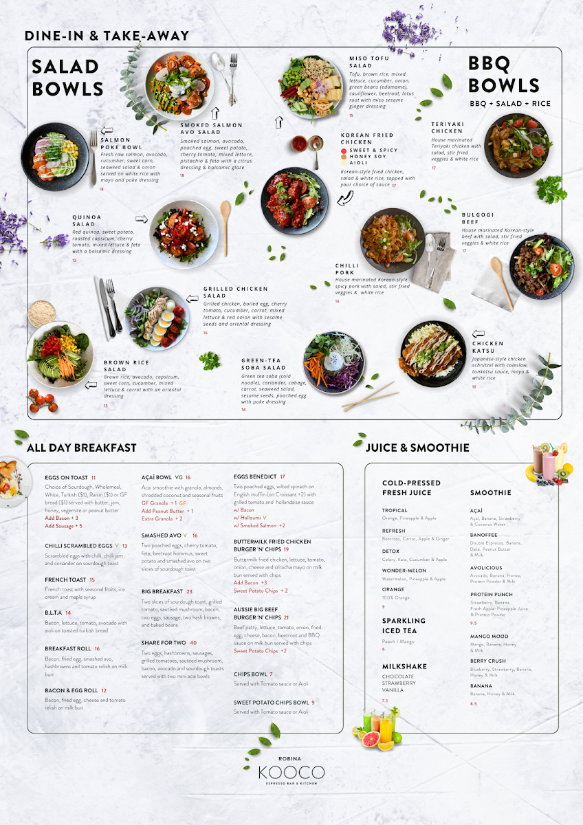 The menu at Kooco Espresso Bar & Kitchen Robina offers a diverse selection of food and beverages suited for breakfast, brunch, and casual dining. It features a range of specialty coffees, smoothies, and fusion dishes combining Japanese and Korean influences.